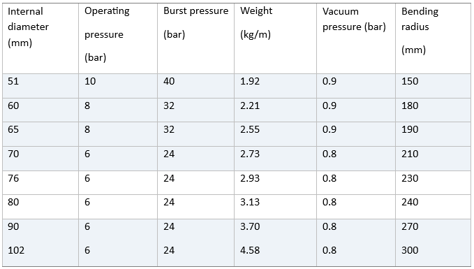 A highly flexible corrugated suction and discharge hose, the Nebraska/240SPC 24C is offered as standard with a white inner layer. It is used to create a flexible connection between the compressor and the silo for unloading bulk materials and hot air.